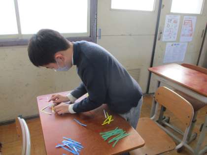色のついた棒を使って、三角形を作りました。