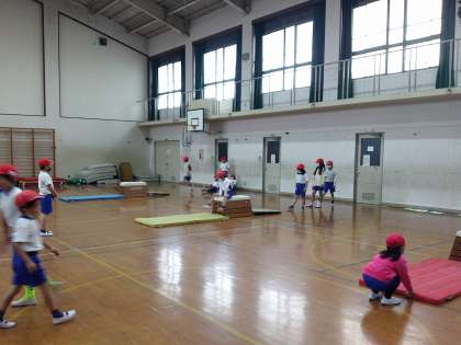 「とびばこあそび」をしています。1年生で学習した跳び方を復習しました。久しぶりのとびばこ遊びに少し緊張したようです。準備や約束事などしっかりと覚えて取り組めました。