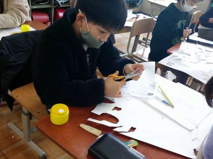 「たのしくうつして」の学習です。紙版画の版を作っています。顔が完成しました。