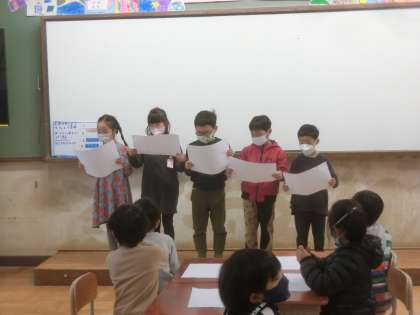 「たのしいな ことばあそび」の発表会をしました。それぞれがかんがえた「〜の中には〜がある。」を班でだしあい,全体で交流しました。工夫を凝らした,言葉遊びがたくさん出てきました。