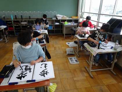 6年生になって初めての毛筆の学習に取り組みました。漢字とひらがなの組み合わせで、文字のバランスをとることが難しかったようですが、一生懸命最後まで取り組んでいました。