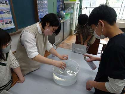 ものを燃やす働きがある気体の正体を明らかにするため、グループで協力しながら実験に取り組みました。