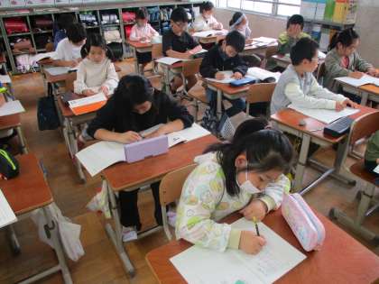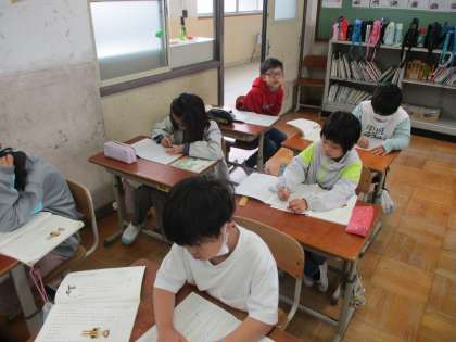 今までに考えた内容をもとに第3場面の物語を書いている様子です。
