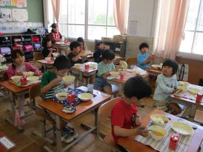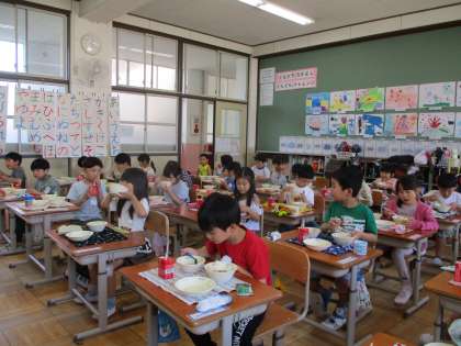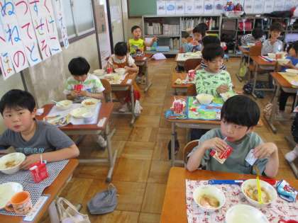 今日の給食は、「ツナそぼろ丼」と「トマトだご汁」でした。