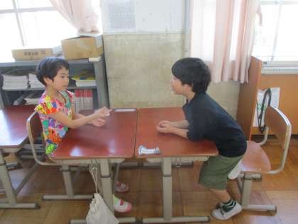 今日は、隣のお友達とサイコロをつかって「7になあれ」ゲームをしました。
