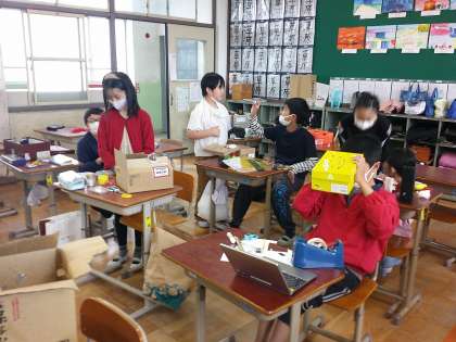 図画工作で「のぞいてみると」という立体作品をつくる学習をしています。箱の中の世界を想像し、光の入り方を意識して作っていきます。何度も箱の中を覗き込みながら作品を作っています。