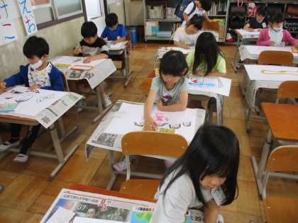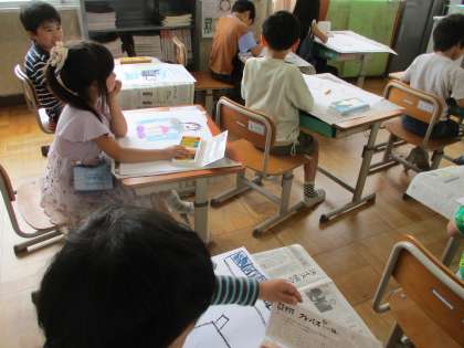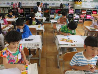 勉強している様子や、友達と遊んでいる様子など、学校生活のことを絵に描きました。