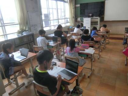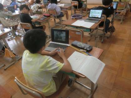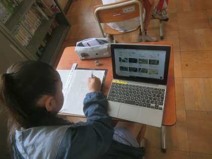 「1つの花」の物語背景である戦争中のことをタブレットを使って学習しました。戦争について知っていることといわれると,子どもたちからは,「国同士の争い」「人が亡くなる」「建物が焼ける」などが出てきました。タブレット学習後は,沖縄県にアメリカ軍が来たこと・子どものころから訓練したこと・集団疎開など具体的な話がでました。