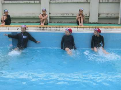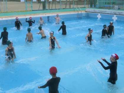 今日から中学年の水泳学習が始まりました。1年ぶりの水泳学習をとても楽しみにしている子が多くいました。今日は,学校のプールでの約束を思い出しながら,水慣れをしました。少し肌寒さもありましたが,たくさんのにこにこ笑顔が見られました。