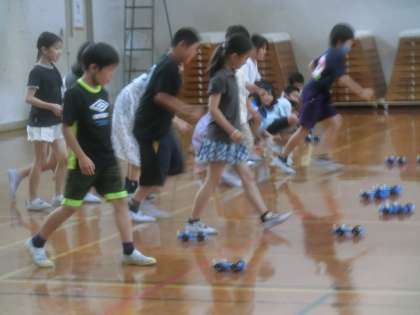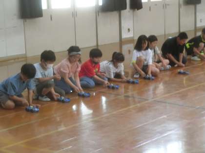 電池の働きの学習のまとめとして,モーターカーを動かしました。直列つなぎと並列つなぎとでスピードを比べたり,電池1本と2本とでスピードを比べたりしました。これまで学習してきたことが目に見えて実感でき,さらに深い理解につながりました。