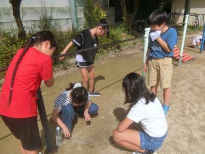 今日の理科では,運動場の雨水のゆくえを探りました。どこに雨水がたまり,どのように流れていくか,ラップの上に流した水の流れ方から答えを見つけました。昨日降った大雨が,次の日には,もう乾いていることに驚いていました。