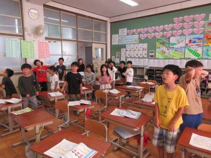 同じリズムのくりかえしがあることに気付いた後、鐘の音で歌うチームと歌詞で歌うチームに分かれて、合唱にチャレンジしました。