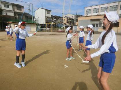 なわとびの練習をしています。なわとびカードを見ながら、自分でめあてを決めて取り組みます。中には,カードの項目すべてクリアしている子もいて、みんなのお手本係となってくれています。二重跳びとサイドクロスの練習に熱が入っています。