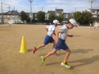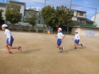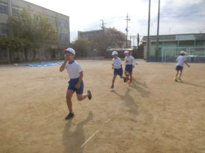 縄跳びの後は,ペース走もしています。5分間同じペースで走れるようにペース配分を考えています。途中で苦しくなった時に、応援してくれる友達の声は力に変わりますね。みんなで応援し合って、がんばっています。