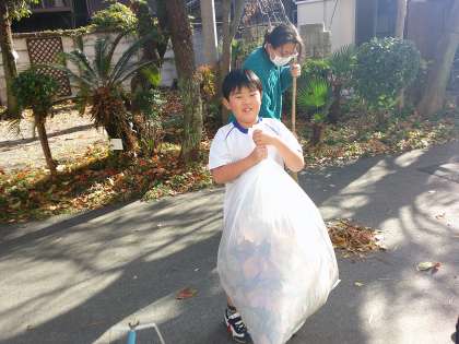 紅葉のきれいなこの季節、気付けば落ち葉がいっぱいです。たくさんの落ち葉に気付いた4年生たちは、おもむろにほうきを準備しお掃除を始めました。きれいになるのが楽しい、おもしろいとお掃除を楽しんでいます。