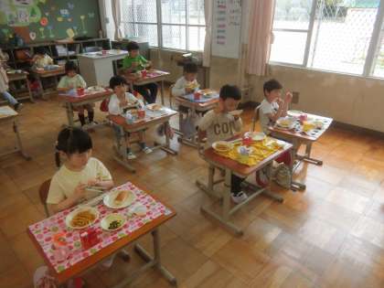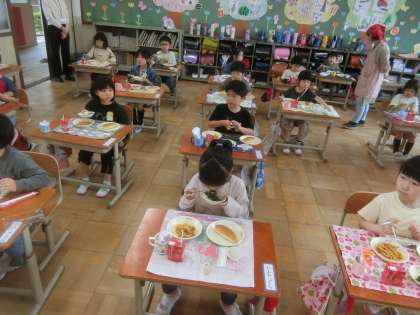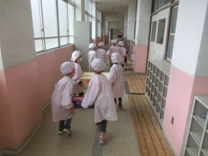 はじめての給食を楽しみにしていた1年生は、ルンルンで準備しました。当番はエプロンをつけて、お仕事をがんばりました。配膳もスムーズでおどろきました。給食を食べながら「おいしい。」とあちこちから聞こえてきました。