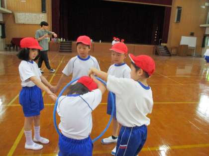 友だちと一緒にストレッチをしたり、フラフープを使って体を動かしたりました。