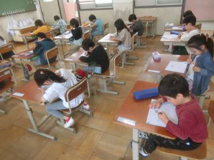 1年生はひらがなの練習が始まっています。お手本を見て、マス目を意識しながら書いています。とても丁寧に書けています。この調子でがんばっていきましょう。