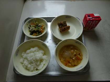今日の献立は、「ごはん・牛乳・さばのたつたあげ・小松菜と切干大根の煮びたし・いものこ汁」でした。たつたあげは人気メニューの一つで、カラッと揚がっていて食感も楽しみながらいただきました。今日も美味しい給食、ごちそうさまでした!