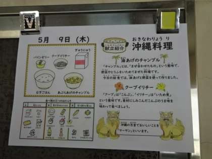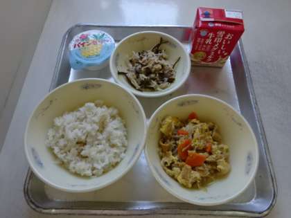 今日の献立は、「麦ごはん・牛乳・あぶらあげのチャンプル・クーブイリチー・パインゼリー」でした。沖縄の料理を今日は味わいました。今日もおいしい給食,ごちそうさまでした!