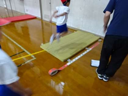 スポーツテストで、今日は立ち幅跳びに挑戦です。タイミングよく、そして力強く跳んで、自分の記録に挑戦していました。