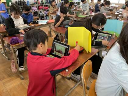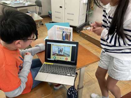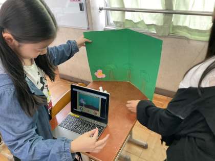 今日はコマどりアニメーションの仕組みを使って、楽しい動画を作りました。思った動きになるように何度も試しながら、用具を動かしたり、色画用紙をうまく利用したりしている姿が見られました。普通なら動かないものが動くおもしろさを発見することができました。
