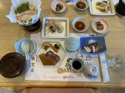 夕食の時間です。見晴らしのよい食堂でいただきます。班ごとに美味しくいただきました。