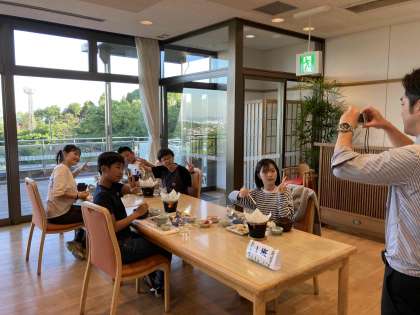 食事の様子を記念撮影です。みんないい表情です。ごちそうさまの後は、入浴です。