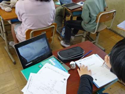 「天気の変化」について学習している5年生。今日は時間の流れとともに雲が動いて形を変えていく様子をタブレットを使って調べました。