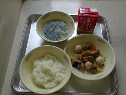 今日の献立は、「ごはん・牛乳・うずら卵とキャベツのいため煮・とうふと青菜のスープ」でした。
