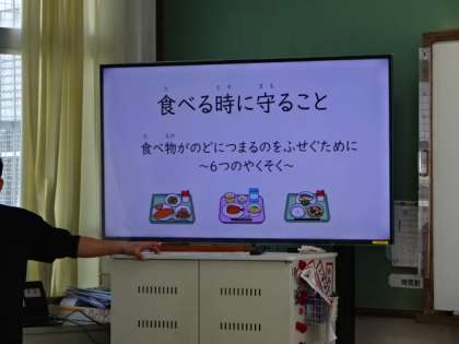 これからも給食を楽しく安全に食べることができるように、各教室では「食べるときに守ること」をみんなで確認しています。のどに詰まらせたりしないように、これからも気を付けて食べるようにしてほしいです。