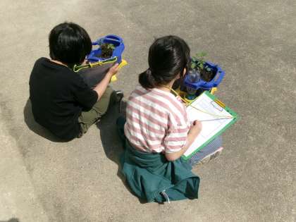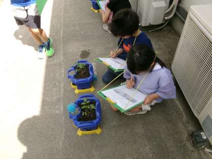 生活科でミニトマトの観察をしました。ミニトマトの茎や葉の様子をよく観察していました。みんな早く実がなってほしいなと言っていました。大切に育ててほしいと思います。
