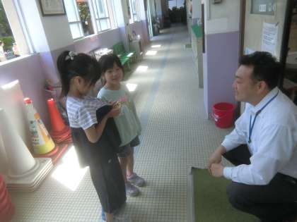 校内の先生のことをもっと知るために、質問に行きました。好きな食べ物や好きな遊びなどを聞き、先生との共通点が見つかったようでした。次の学習では、先生の紹介をします。
