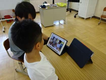 自分のリコーダー演奏の様子を録画して、自分の演奏を振り返っています。次はタンギングの強弱に気を付けて、美しい音色で演奏できるようにしていくことが目標です。