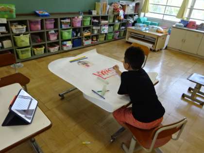 自画像を描いています。自分のお気に入りのものも一緒に描いています。集中して取り組んでいます。