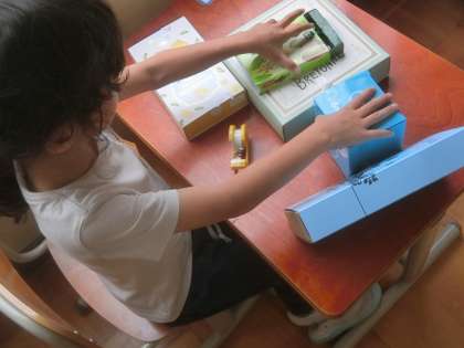 今日の図画工作は「はこでつくったよ」の学習をしました。さまざまな箱をテープで貼り合わせて、動物や乗り物をつくりました。動くところを作ったり、思い通りになるように箱を切ったりと楽しく活動しました。