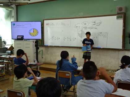 分数の学習をしています。自分が考えたことを発表し、互いに意見交換をしながら、答えを求めていきます。よりよく求めていく方法をみんなで考えています。