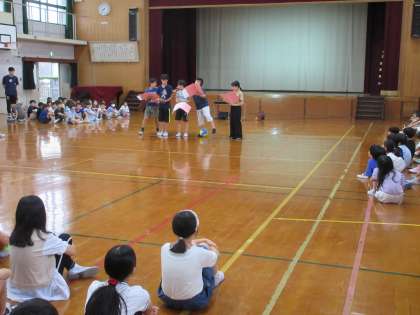 本日、体育館にて児童朝会を行いました。児童会からは梅雨の時期でも体を動かし遊べる「円陣バレー」を紹介しました。「円陣バレー」は手を広げて輪になり、そこから2〜3歩広がった中でバレーのトスやボレーを交え、何回続くのかを競う遊びです。手本を見せたのですが、「1回・2回・・・」と数えていき、50回を超える手本を見せ、皆を驚かせていました。