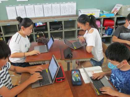 国語科の授業の様子です。グループでデジタル機器を使う際に気をつけたいことを提案する文章をパワーポイントで作っています。自分の役割を意識して協力しグループ活動に取り組んでいます。