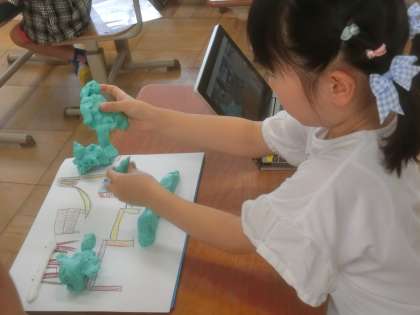 今日の学習はねんどを使って「いっしょにおさんぽ」をつくりました。自分と動物がお散歩にでかけます。うさぎや犬・魚や恐竜など一緒にお散歩できたら楽しいだろうなと考えながらつくりました。