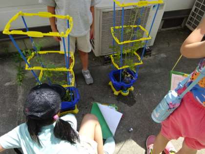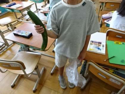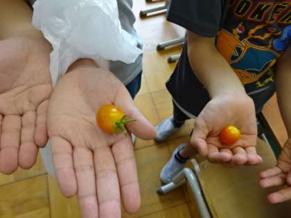 ミニトマトやキュウリを収穫し、嬉しそうに報告しに来てくれた2年生です。これからも水やりを欠かさず、大事に育てていきます。