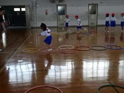 とびあそびを楽しんでいます。フラフープをリズムよく跳んでいけるように、友だちと声をかけあって跳んでいます。