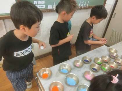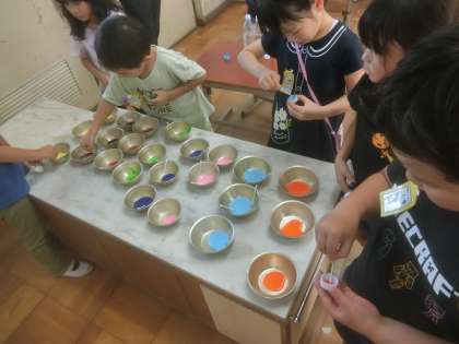 「カラフルいろみず」をつくりました。絵の具を使ってきれいな色水を作りました。2色の絵の具を混ぜて、混ぜ色の色水も作りました。ペットボトルのキャップに絵の具を塗って、最後に思いっきり振りました。