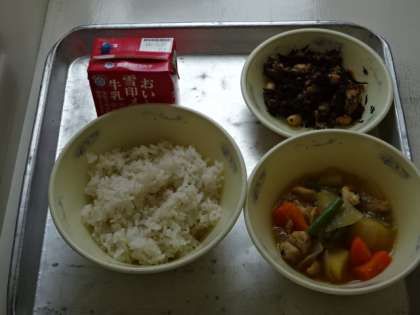 今日の献立は、「麦ごはん・牛乳・鶏肉と野菜の煮つけ・ひじき豆」でした。鶏肉と野菜の煮つけは、じゃがいものホクホクとした食感と野菜のあま味を感じながらいただきました。今日も美味しい給食、ごちそうさまでした!