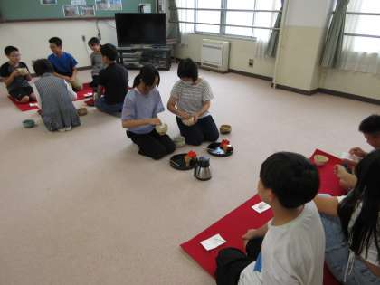 初めての盆点前に戸惑いながらも、教えてくださることをしっかり聞いて、自分で点てたお茶を味わいました。室町時代から伝わる日本の伝統文化にふれる機会となりました。
