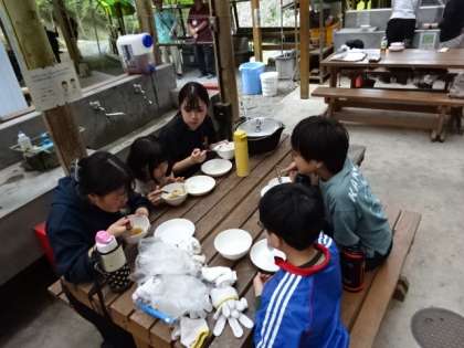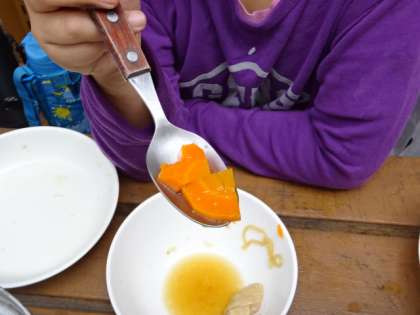 班の協力もあって、どの班もおいしいすき焼き風煮が完成です。ハート形のラッキーニンジンを作ったり、ほかの班のも味見したりして、みんなで美味しくいただきました。