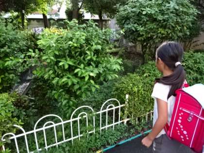 登校した際、朱六の森の木々にいるアゲハの幼虫を発見し、教えてくれました。日常の中で、生き物の成長を実感する朱六の子たち。子どもたちにとっては、朱六の森も大事な学びの場です。