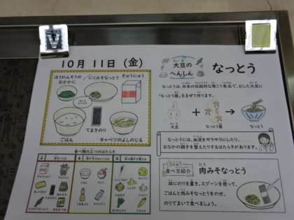 今日の献立は、「ごはん・牛乳・肉みそ納豆・手巻のり・ほうれん草のおかか煮・キャベツの吉野汁」でした。肉みそ納豆はごはんと一緒に手巻きのりにしていただきます。みんな嬉しそうに頬張っていました。今日も美味しい給食、ごちそうさまでした!