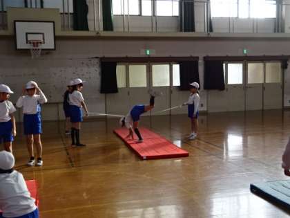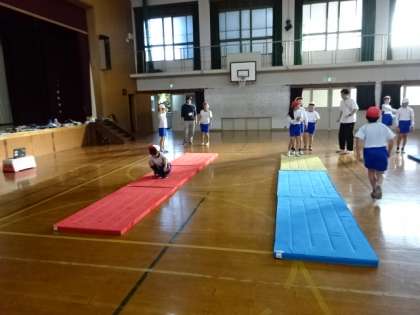 マット運動の様子です。技に丁寧に取り組む5年生。できない技ができるように、友だちと声をかけあいながら取り組む場面もありました。