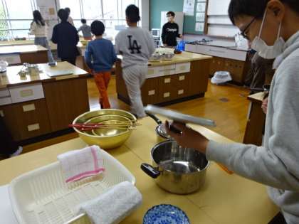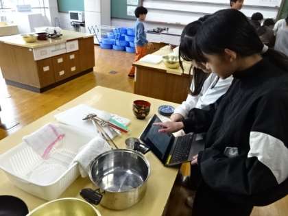 調理実習に向けて家庭科室で準備をしていた6年生。各グループで考えた献立を調理します。栄養のバランスも考えて作られた献立です。美味しく調理できるように、協力して実習に向かいたいと思います。